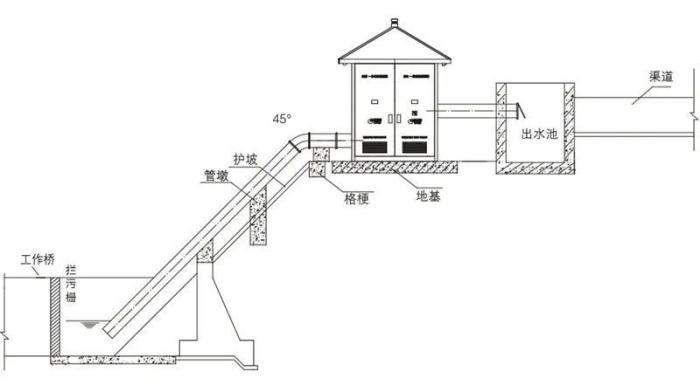 一、地基须预埋排水管、电源进线电缆管、控制信号进线电缆管和接地管。电源进线电缆管和控制信号进线电缆管采用金属包塑料软管,口径不小于50mm,电源电缆需从电源进线侧引入泵房内;防雷接地采用镀锌角钢规 格为40×40×4,埋入土中不低于0.8m;泵房地基外边缘离泵房边缘必须大于500mm。 二、泵房进水口须设置拦污设施(拦污栅),拦污设施要求如下:需要安装在进水池入口处,示意如下。拦污栅的栅条间距应根据水泵、水轮机的形式和转轮直径以及污物性质、数量等选择最大允许值。一般大于50mm,小于200mm。